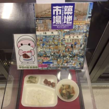 写真中央は、本日の献立と給食図書です。本日の給食図書は、「絵でみる魚市場の一日 築地市場」でした。水産物の取扱いが日本一の築地市場のせり等の様子が、絵で説明されている図書でした。