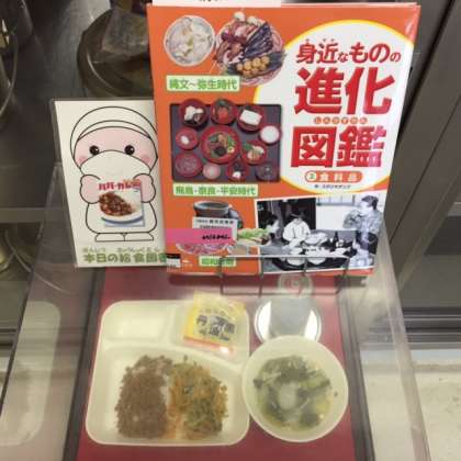 写真中央は、本日の献立と給食図書です。本日の給食図書は「身近なものの進化図鑑 食料品」でした。日本の食の歴史が載っている図書で、学校給食のことも書かれていました。ビビンバは1985年頃から給食に登場したそうです。