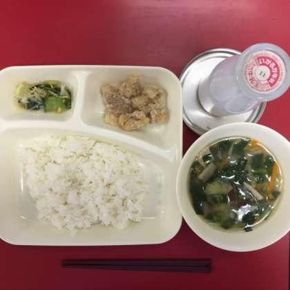 本日の献立は「鶏肉のからあげ・中華スープ・チンゲンサイともやしの甘酢あえ・ごはん・牛乳」でした。