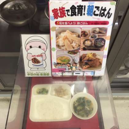 写真中央は、本日の献立と給食図書です。本日の給食図書は「家族で食育!朝ごはん」でした。旬の朝ごはんの献立が、たくさん載っている図書でした。