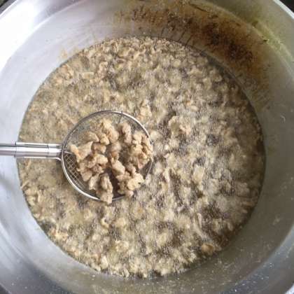 写真右は、鶏肉のからあげを揚げている様子です。