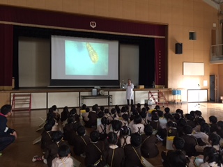 1年生が「ホタルの幼虫放流会」をしました。初めに講堂で「ホタル博士」の西岡先生のお話を聞き、「ホタルの一生」のビデオを見ました。また実際のホタルの幼虫を顕微鏡で拡大してスクリーンに映し、「みつけたよカード」にスケッチしました。