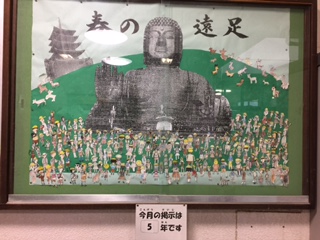 学校のグリーンマット横の掲示板には、毎月各学年が順番で掲示物を作って貼っています。5月は5年生で、先日遠足で行った奈良の大仏をテーマに楽しい掲示物ができました。また参観等の折にご覧ください。