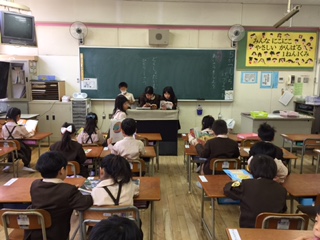 本校では毎月第1週目を「読書週間」として、朝会のない火・水・金曜日の8:35〜50、各クラスで「朝の読書」をしています。他の週は火曜日が「読書タイム」です。2年生以上は、学校図書館で借りてきた本や、学級文庫や、家から持ってきた本を各自が読んでいます。1年生は図書委員が教室へ行って、絵本の読み聞かせをしています。