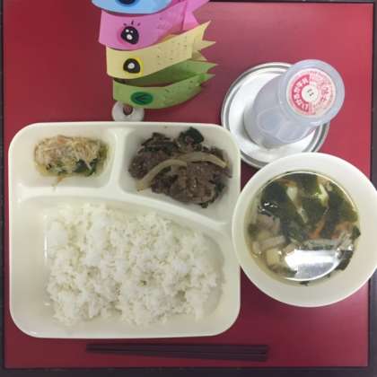 本日の献立は「プルコギ・とうふのスープ・チンゲンサイともやしの甘酢あえ・ごはん・牛乳」でした。