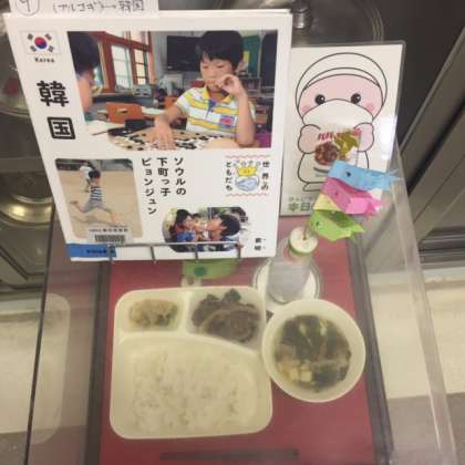 写真中央は、本日の献立と給食図書です。本日の給食図書は「世界のともだち 韓国」でした。ソウルに住む男の子の毎日の生活が載っている図書でした。