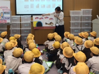 片道約20分の道のりを交通ルールを守り、最初の目的地「鶴見図書館」に到着しました。図書館では、静かに図書館の人の話を聞く様子や自分で本の場所をタッチパネルを使って探している様子が見られました。