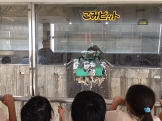 本校は5学級と児童数が多いため、午前に3クラス、午後に2クラスに分けて見学に行きます。地下鉄鶴見緑地駅から鶴見緑地内を歩いて、工場に着きました。初めにビデオで工場全体の様子を見た後、工場の人の案内で、プラットフォームやごみピットを見て回りました。中でも深いごみピットから巨大なクレーンがごみを挟んで持ち上げる様子は「大きなUFOキャッチャーみたい」と驚いていました。見学後の質問タイムでも、たくさん手が挙がりました。