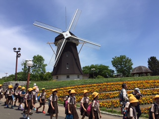 工場を出て、鶴見緑地でお弁当を食べるところで、午前と午後のクラスが顔を合わせました。今日の見学はこれからの社会科学習にとても役に立つでしょうね。