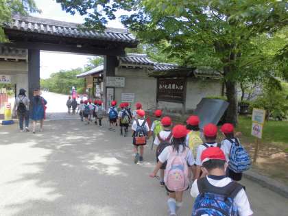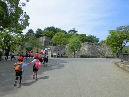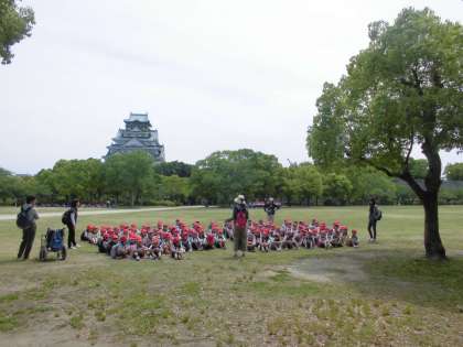 5月17日(水)に、小学校に入って初めての遠足、大阪城公園へ行ってきました。気持ちの良い天気の中、大阪城公園の中をたくさん歩きました。間近で見る大阪城に「大きい!」「かっこいい!」「金色の虎の絵がある!」など、興味津々で見ていました。
