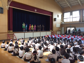 初めに「ニコニコ小学校」の先生や子どもたちが、あまりあいさつをしないのを見て、黒装束の人たちが「あいさつなんて必要ない。」とそそのかします。そこへあいさつレンジャーが現れて、みんなの力も借りながら「あいさつは大切でよ。」と訴えます。最後に「来週はあいさつ週間です。自分から進んで元気にあいさつしましょう。」と呼びかけました。