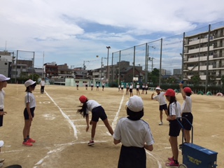 暑い中を子どもたちは水筒持参で、自分の記録を伸ばそうと一生懸命がんばりました。今後はこの記録をもとに、ふだんの体育で補強運動を行い、一部種目では秋にまた測定して記録の伸びを調べます。体育だけではなく、ふだんの遊びからいろいろな運動をするといいですね。