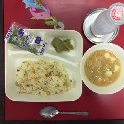 本日の献立は「かやくご飯・みそ汁・まっ茶ういろう・牛乳」でした。