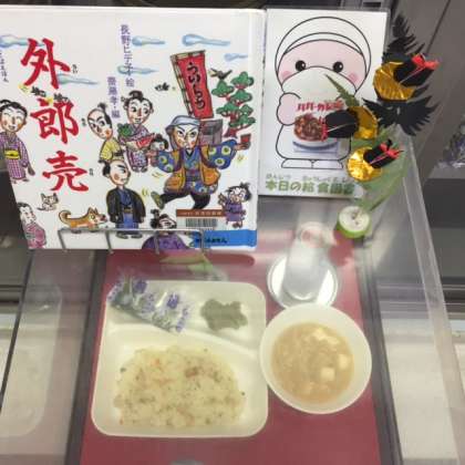 写真中央は、本日の献立と給食図書です。本日の給食図書は「外郎売(ういろううり)」でした。江戸時代に作られた歌舞伎十八番の一つで、早口言葉を言いながら外郎を売り歩く商人のお話でした。