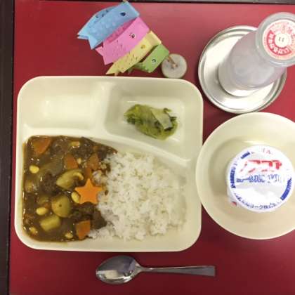牛肉と大豆のカレーライスは、牛肉、大豆、たまねぎ、にんじん、じゃがいもが入った、児童に人気のカレーライスの献立でした。本日のカレーには星形のラッキーにんじんが入っていました。