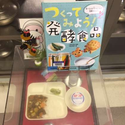 写真中央は、本日の献立と給食図書です。本日の給食図書は「つくってみよう!発酵食品」でした。ヨーグルト、漬物、パン等、いろいろな発酵食品の作り方が載っている図書でした。