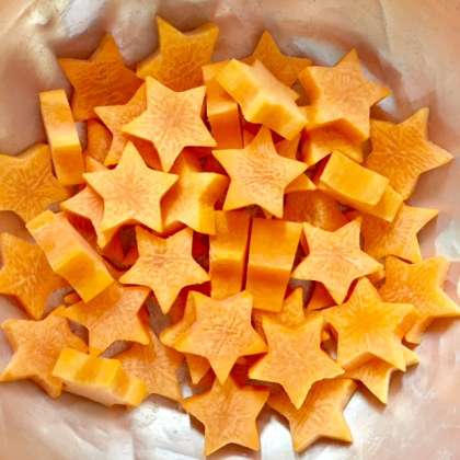 写真右は、茹でる前のラッキーにんじんです。ラッキーにんじんは各学級のカレールウに一つずつ入ってる、当たると本当にラッキーなにんじんです。