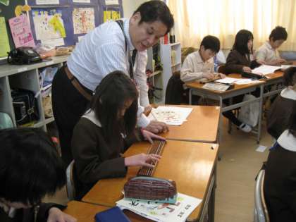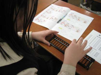そろばんの持ち方や珠のはじき方、計算の仕方などを習い,子どもたちは楽しく88そろばんと格闘していました。
