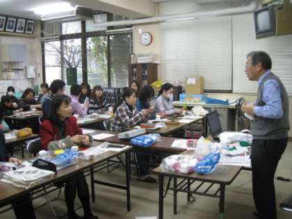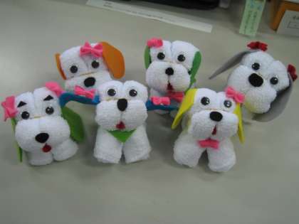 研修の最後に先生たちも子どもになったつもりで、東山先生の用意してくださったタオル等の材料をもとにかわいい犬を作りました。