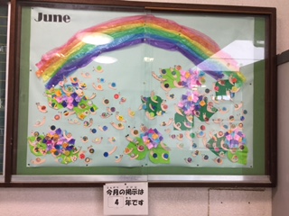 グリーンマット横の掲示板には、4年生が牛乳キャップで作ったかわいいカタツムリとアジサイが飾られています。
