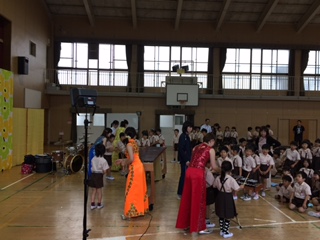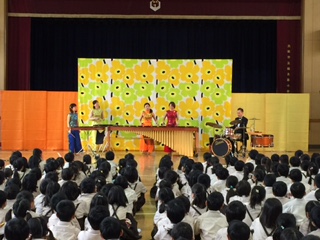 講堂へ入ると、正面には見たこともないような長いマリンバが置いてあって、子どもたちはどんな音がするんだろうと興味津々です。パーカッションの方の司会でコンサートが始まり、4人の女の方が低い音から高い音までパートを手分けして次々に曲を演奏していくと、子どもたちは音楽の世界に引き込まれていきました。トロンボーンが出てきたり、「ドレミの歌」ではサプライズで先生たちが前に並んで振り付けをしたりしてコンサートは進みました。アンコールの後、一人一人がマリンバで音を出す機会も作ってくださいました。子どもたちは「楽しかったです。」「マリンバの音を聞いてウキウキしました。」「自分でもあんなに上手に演奏できたらいいなと思いました。」と言っていました。マリンバ・カンパニーの皆さん、楽しい時間をありがとうございました。