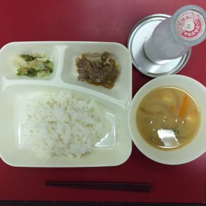 本日の献立は「豚肉のおろしじょうゆかけ・みそ汁・野菜いため・ごはん・牛乳」でした。