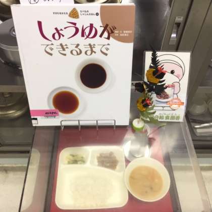 写真中央は、本日の献立と給食図書です。本日の給食図書は「しょうゆができるまで」でした。伝統あるしょうゆ工場で、大豆や小麦からしょうゆが出来るまでの工程が載っている図書でした。