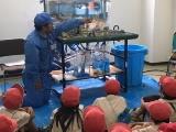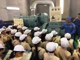 模型を使って説明していただき、抽水所と下水処理場のつながりなどを学習することができました。また、800馬力のエンジンや家庭で使う1か月分の電力を発電できる発電機なども見せていただきました。抽水所にあるポンプを使うと25mプールが8秒でいっぱいになるそうです。見学の最後には発電機を実際に動かしていただき、とても大きな音に驚きました。