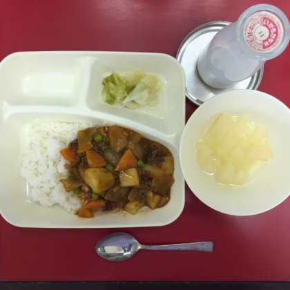 本日の献立は「ハヤシライス・キャベツのゆずドレッシング・和なし(缶)・牛乳」でした。