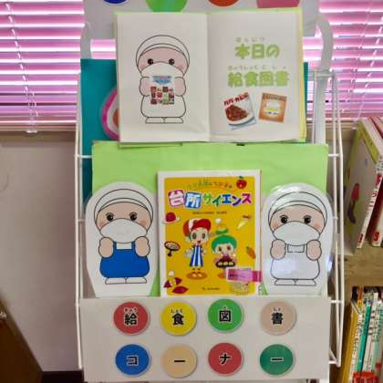 写真中央は、本日の給食図書の「台所サイエンス」です。調理の「なぜ?」がわかる図書でした。
