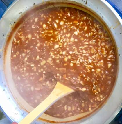 写真右は、ハヤシライスを煮込んでいる様子です。煮込むことで、肉が柔らかくなったり、とろみがでたりします。