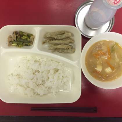 本日の献立は「いわしてんぷら・みそ汁・豚肉と三度豆のいためもの・ごはん・牛乳」でした。
