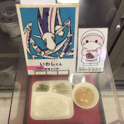 写真中段は、本日の献立と給食図書です。本日の給食図書は「いわしくん」でした。海で捕られたいわしくんが、調理されて子どもに食べられるまでを描いた絵本でした。