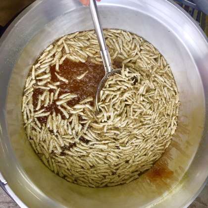 写真下段は、いわしてんぷらを揚げている様子です。