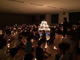 昨日の夕食は「田舎風味噌鍋」でした。みんなで美味しくいただきました。キャンドルファイヤーはろうそくの灯りに始まり、みんなでゲームを楽しみました。夜10時の消灯後は、よく眠れたようですが、朝は早く目覚めた子も多くいました。グラウンドで鳥の声を聞きながら、ラジオ体操をしました。
