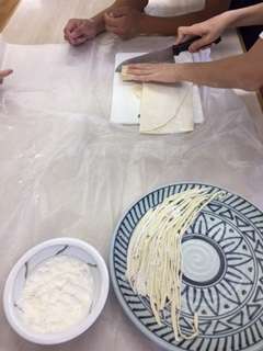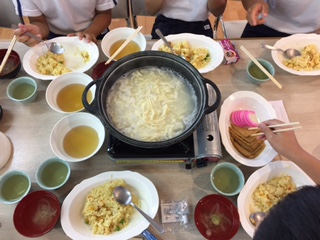 6月15日(木)楽しかった湖っ子スクールも最後の活動を迎えました。それは活動班みんなで協力して、うどん作りをすることです。小麦粉に水を混ぜてよくこねたものを約1時間寝かせておき、棒で延ばします。これを畳んで麺の太さに切って出来上がりです。湯がいてお出汁で食べると、みんな美味しいと言っていました。