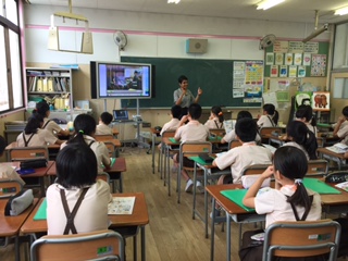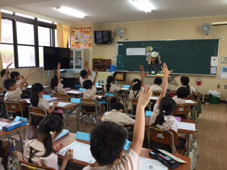 6年生は、昨日「湖っ子スクール」から帰ってきたばかりですが、みんな元気に登校してきました。外国語活動ではC-NETのTiffany先生に英語で「私はカヌー(カヤック)に乗ることができます。」という表現を教えてもらってさっそく使っていました。