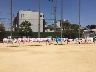 今日は5,1,3,6年生で体育の授業があり、プール水泳学習をしました。初日ということで、どの学年も安全面の約束を確認したり、水慣れをしたりしました。プールから上がってきた子どもたちは「水は少し冷たかったけど、気持ちよかったです。」と笑顔で言っていました。(水着の子どもの写真は載せられないので、誰もいないプールと、バスタオルを鉄棒に掛けている写真を載せています)