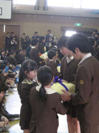 1〜5年が待つ講堂中央に作られた花道を6年生が少し照れくさそうに通って集会が始まりました。6年生もなかよし班に入って楽しいゲームをした後、1〜5年が書いたメッセージカードを貼った寄せ書きを6年生にプレゼントしました。6年生はとても嬉しそうな顔で読んでいました。