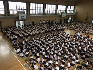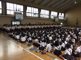 6月22日(木)1〜6年の全学年が、終業式や児童集会の場で、ふだんの学習の成果を発表しています。今日は、そのトップをきって3年生の発表がありました。