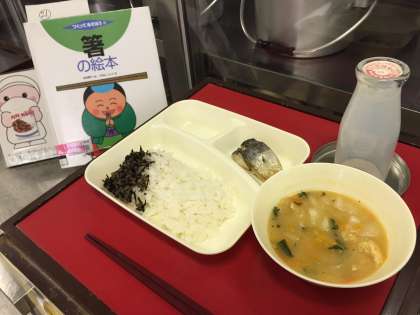 上段の写真は、本日の献立と給食図書です。本日の給食図書は「箸の絵本」でした。日本とアジアの箸文化のちがいや、マイ箸の作り方等が載っている図書でした。