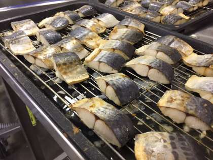 さごしの塩焼きは、塩、料理酒で下味をつけたさごしを、焼き物機で蒸し焼きにした、焼き魚献立でした。さごしにしっかりと味をつける為に、塩、料理酒を絡ませた後、もう一度上から少量の塩をふりかけています。