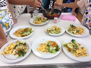 6年生は、家庭科で「朝食に合うおかずの計画を立てよう」の学習をしています。子どもたちが考えた献立が「三色野菜いためとスクランブルドエッグ」でした。調理実習では「フライパンを使っていためよう」というめあてを立てて、グループで協力して野菜を切ったり、フライパンで炒めたり、お皿に盛り付けをしたり、洗い物をしたりしていました。6年生の子どもたちは「切ったり炒めたりするのはむずかしくなかったけど、塩とコショウで味付けするのがむずかしかったです。」と言っていましたが、いざ食べ始めると多くのグループで「すごくおいしいです!」という声が聞かれました。