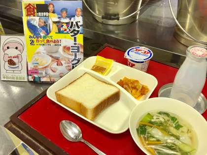 上段の写真は、本日の献立と給食図書です。本日の給食図書は「みんなで調べて作って食べよう バター・ヨーグルト」でした。牛乳からバターやヨーグルトを作って食べる、食の学習図書でした。