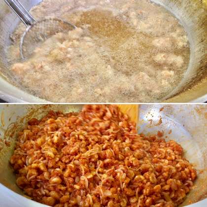 下段の写真は、えびを揚げているところと、えびのチリソースを仕上げているところです。