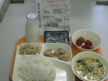 給食の献立も「卒業お祝い献立」ということで、「いそべご飯」(揚げ鶏の生姜醤油かけ、カニときゅうりの甘酢)、ゆばのすまし汁、イチゴという豪華メニューでした。どの学年の子も美味しくいただいていました。
