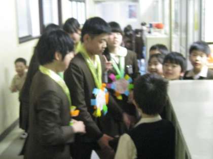昼休みには1年生がいろいろお世話になった6年生に手作りのメダルをプレゼントしました。渡す方ももらった方もニコニコ嬉しそうで、握手したりだっこしてもらったりしていました。