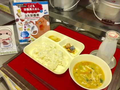 上段の写真は、本日の献立と給食図書です。本日の給食図書は「こども栄養素えほん 3大栄養素」でした。からだを作ったり、動かすもとになる、たんぱく質、脂質、炭水化物の説明が載っている図書でした。