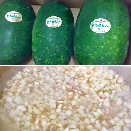下段の写真は、本日使用した冬瓜(とうがん)と、とうがんの煮ものを煮ている様子です。