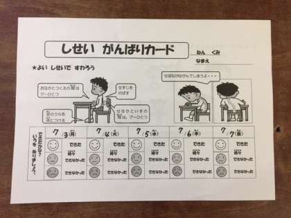 今週は「しせい強調週間」になっています。「しせい がんばりカード」にもあるように、良い姿勢を心がけることで、「落ち着き」や「やる気」「集中力」等が出てくる等、心身ともに良い影響があります。その反対に悪い姿勢を続けていると、背骨が曲がってしまう恐れもあります。